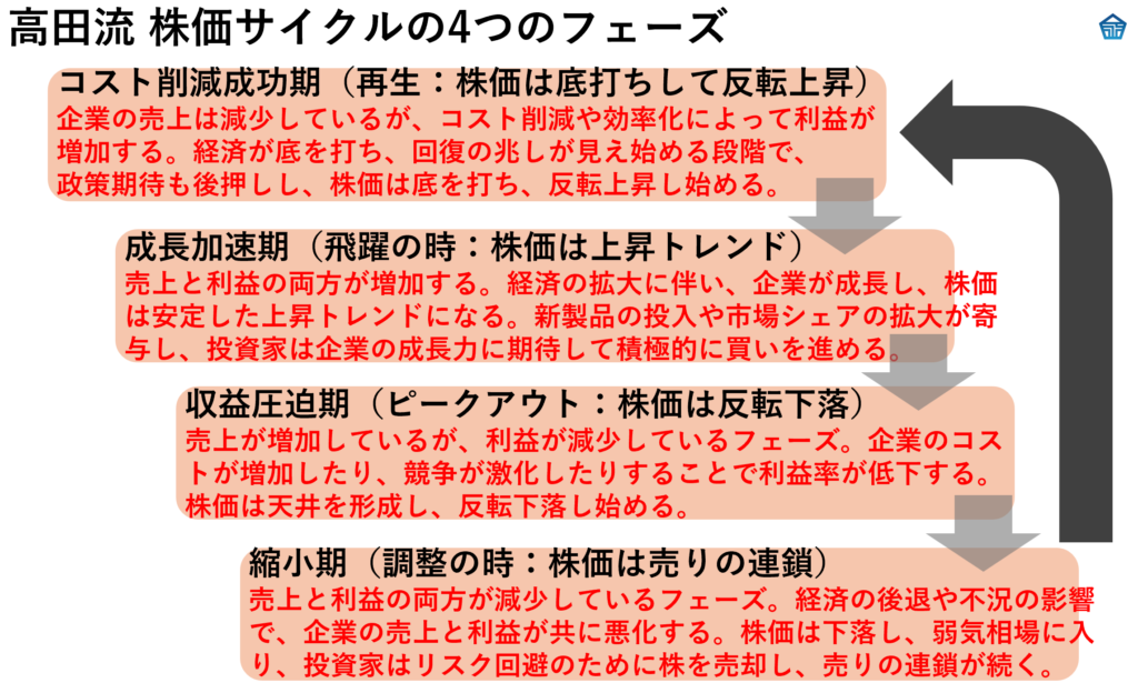株価サイクルは、企業の収益状況や経済環境に応じて株価が変動するパターンを示します。このサイクルを理解することで、投資家はより効果的な投資戦略を立てることができます。高田流では、このサイクルを次の4つのフェーズに分けて説明します。