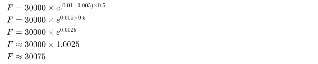 例えば、現在の日経平均株価が30,000円、リスクフリーレートが年率1%、配当利回りが年率0.5%、満期までの期間が半年(0.5年)の場合、フォワード価格は以下のように計算されます: