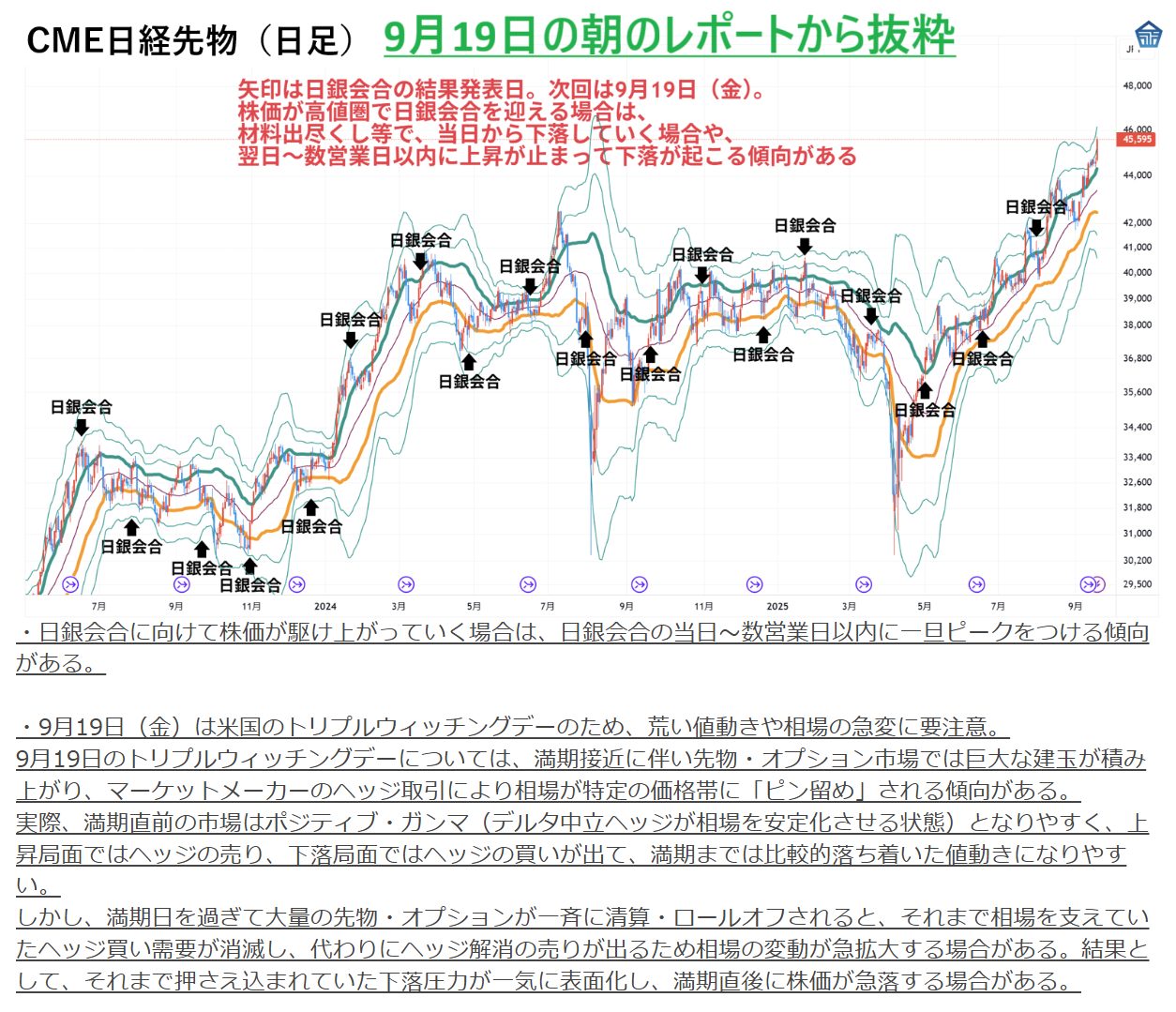 9月19日のトリプルウィッチングデーについては、満期接近に伴い先物・オプション市場では巨大な建玉が積み上がり、マーケットメーカーのヘッジ取引により相場が特定の価格帯に「ピン留め」される傾向がある。
